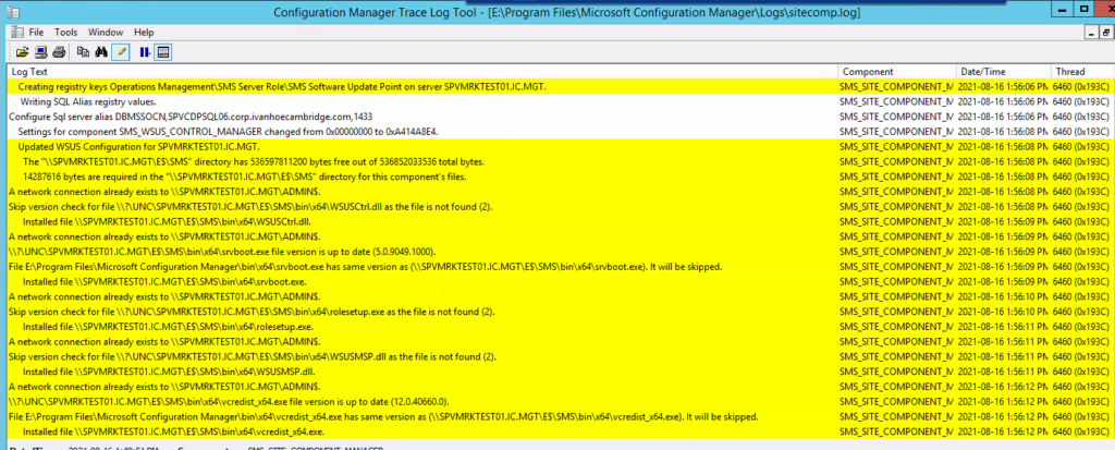 Logs install component: Sitecomp.log Records details about the maintenance of the installed site components on all site system servers in the site. Compsumm.log: Records Component Status Summarizer tasks